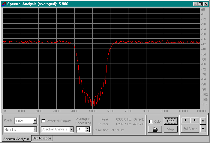 Displayed is a Gaussian Noise signal (it has a flat frequency spectrum) which has been processed by a 130 Tap Band Reject filter to remove the frequencies between 4kHz and 6kHz.